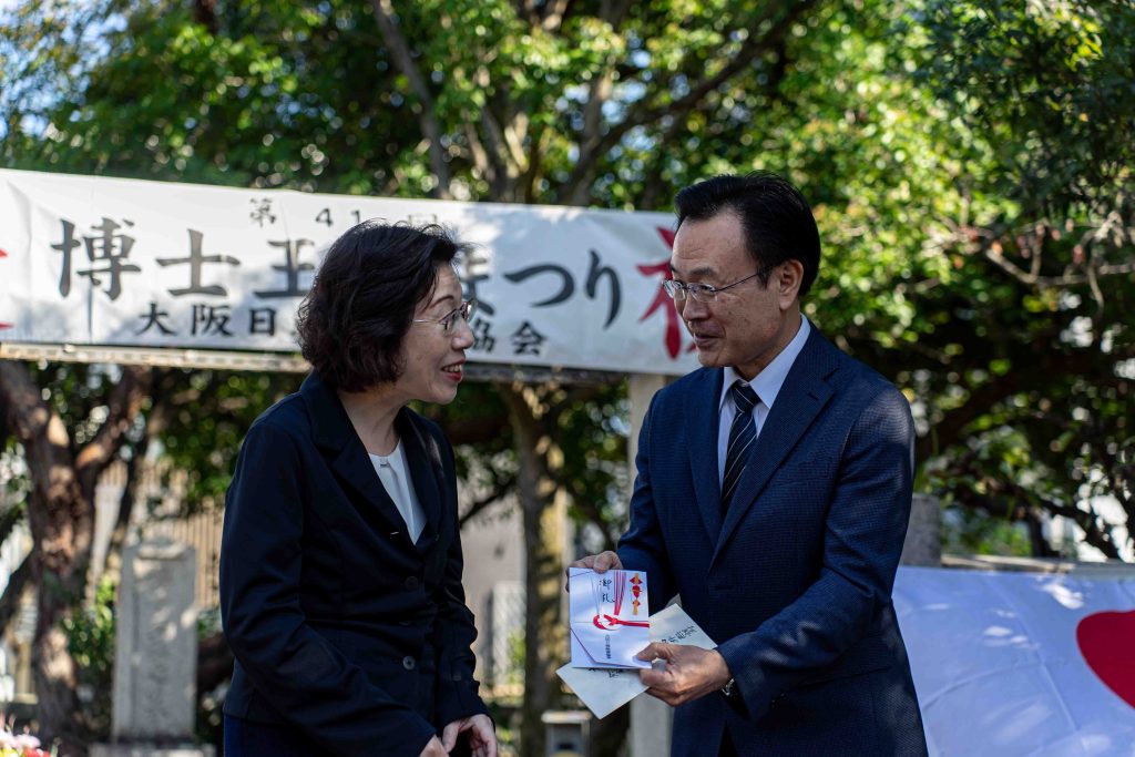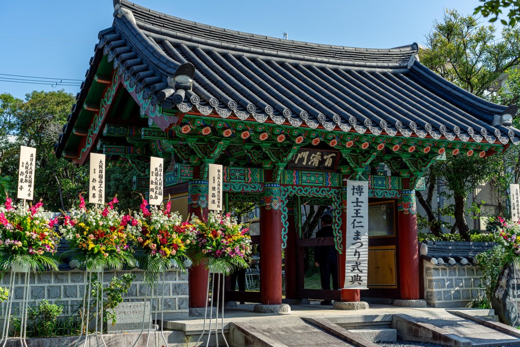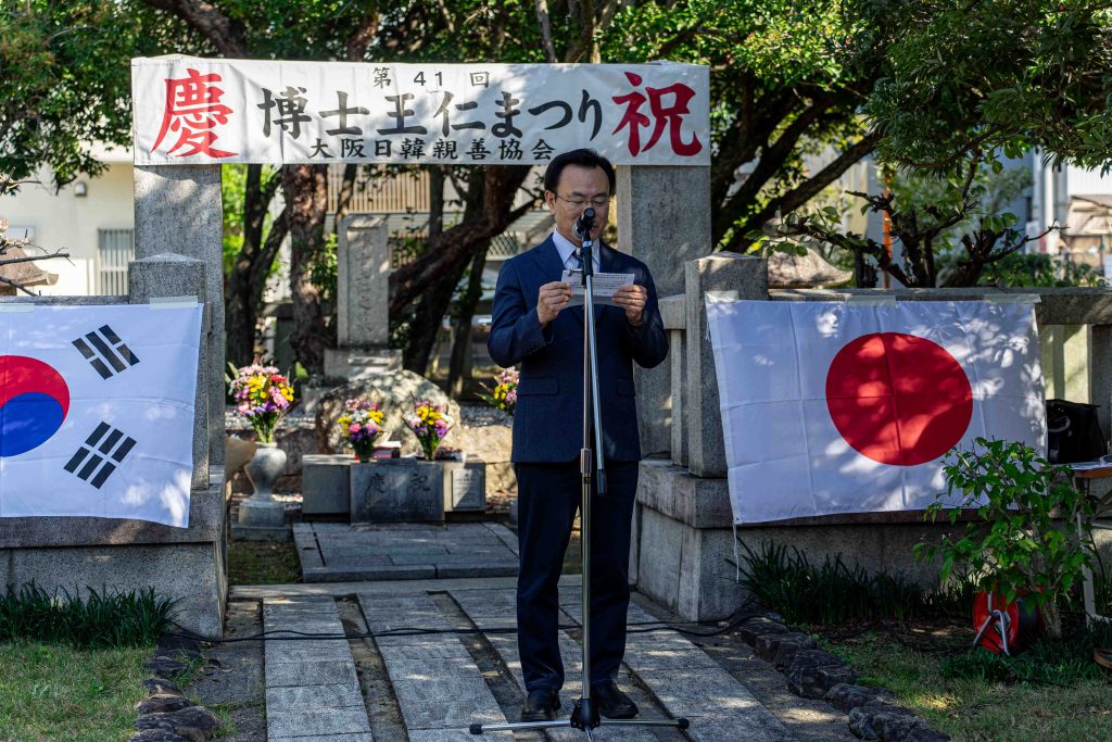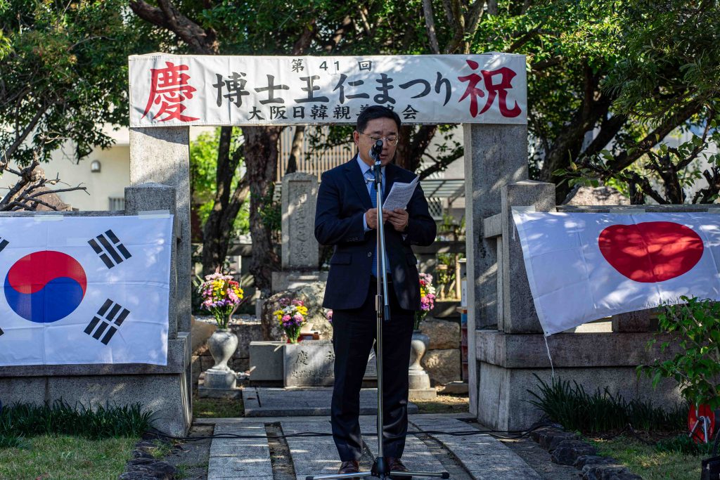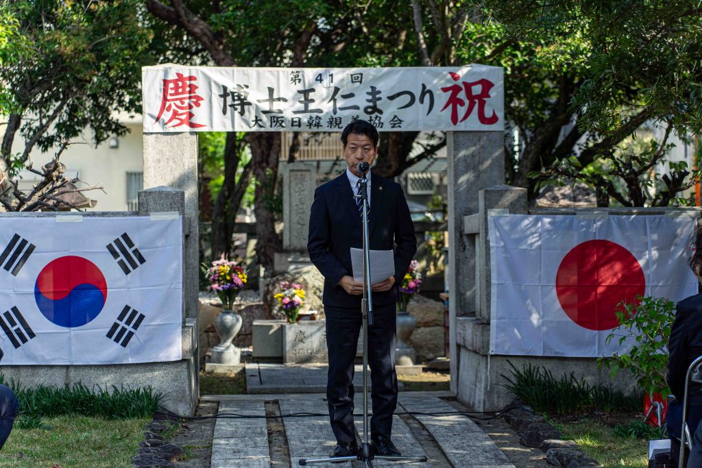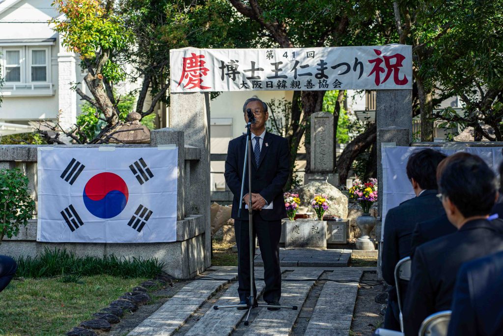 『博士王仁まつり』とは毎年11月はじめに、「伝王仁墓」で行われる「王仁」の顕彰祭である(2024年で41回目を迎えた)。日本からは枚方市長をはじめとする市議会議員や領事館、韓国からは霊岩郡の副郡守をはじめとする代表団が大勢来日し、盛大な日韓交流が閑静な住宅街の中で行われている。