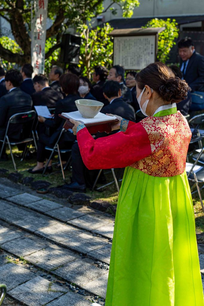 式はまず初めに、チマチョゴリを着た女性たちによる高麗茶の献茶から行われる。
