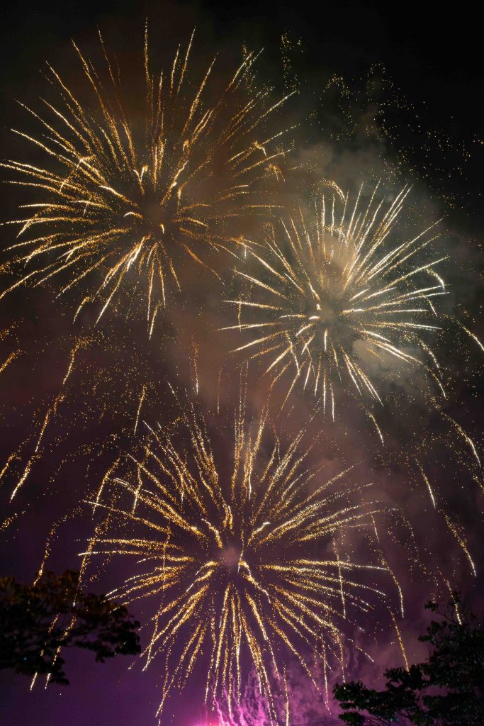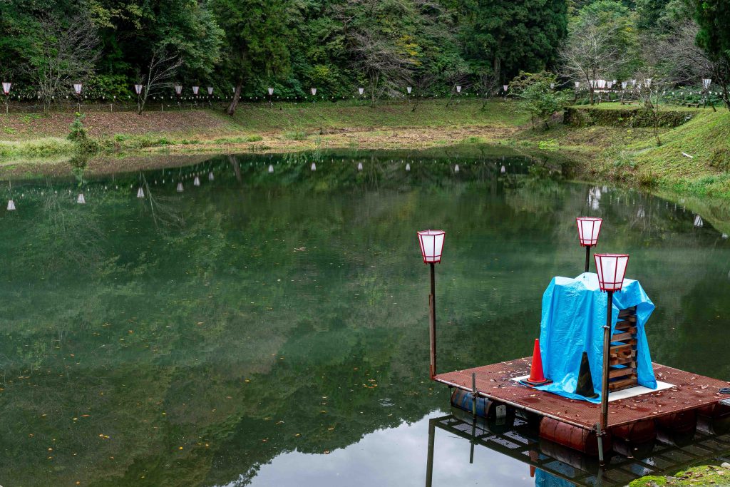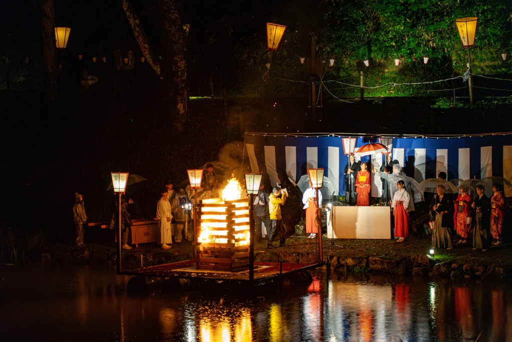 神社から神様を連れた行列は、温泉街の最奥にある玉泉湖を目指し再び巡行を開始する。そして湖に到着すると「神送りの儀」は終了し、いよいよクライマックスの「お焚き上げの儀」となる。