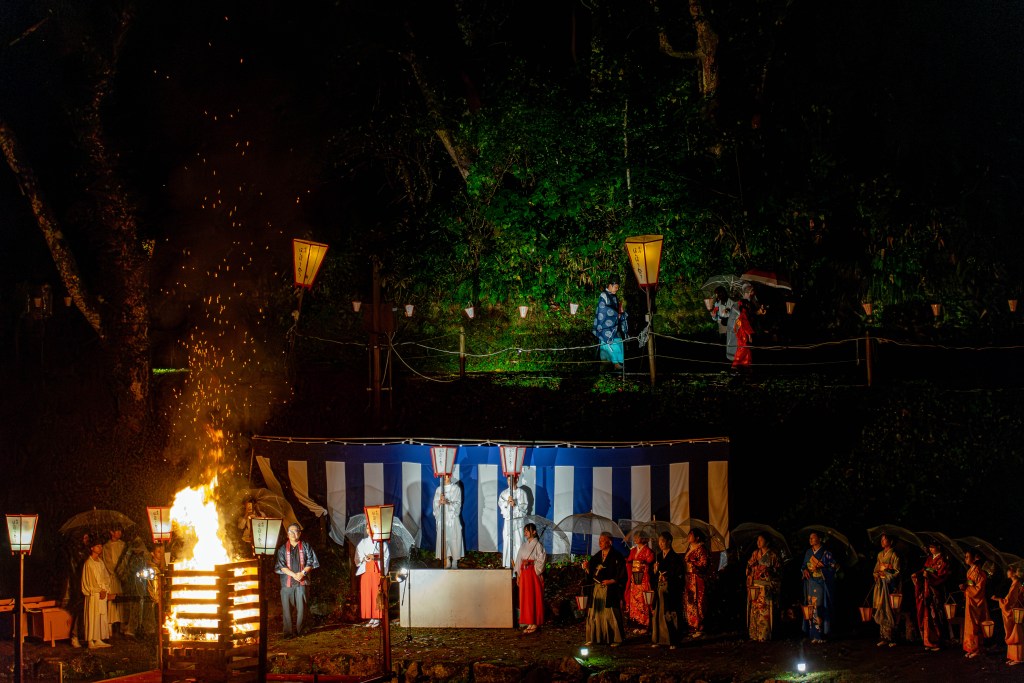 祝詞の奏上が行われるとともに、玉泉湖のほとりでのぞみ札が焚き上げられることで、人々の願いが神様とともに出雲へ旅立っていく。これが儀式の一連の流れである。